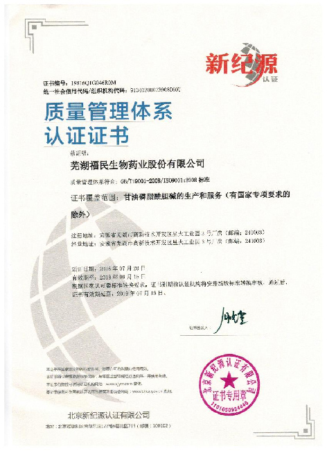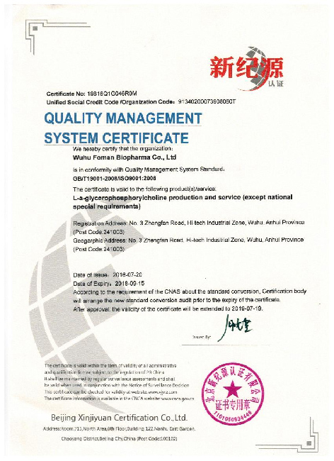 Foman Biopharma is going to apply for the following certificates to guarantee the quality of GPC (Choline Alfoscerate  cas No.: 28319-77-9) etc.